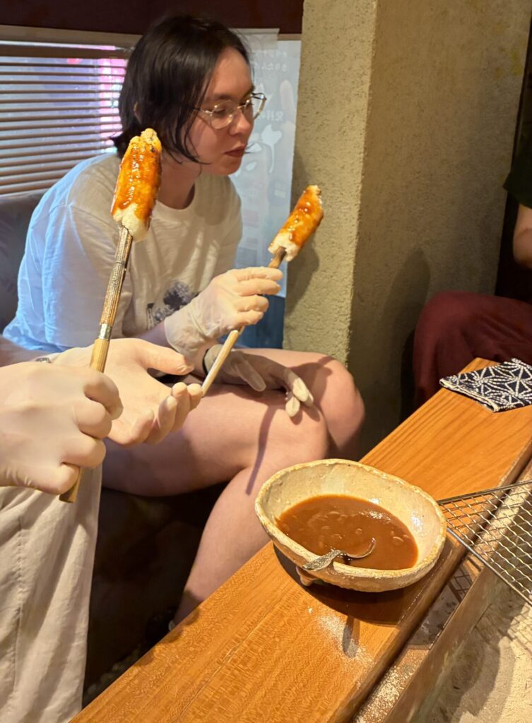 Daar roosteren we de Kiritanpo tot de rijst droog en goudbruin is. Je zou Kiritanpo ook 5 tot 10 minuten in de oven kunnen roosteren terwijl je het stokje regelmatig draait. Als de rijst mooi geroosterd is, komt de eigenaresse met een schaaltje misosaus waarmee we de Kiritanpo besmeren. De miso saus is gemaakt van lichte miso vermengd met een scheutje dashi of water om het wat beter smeerbaar te maken. We smeren de rijststokjes in en dan is het smullen.