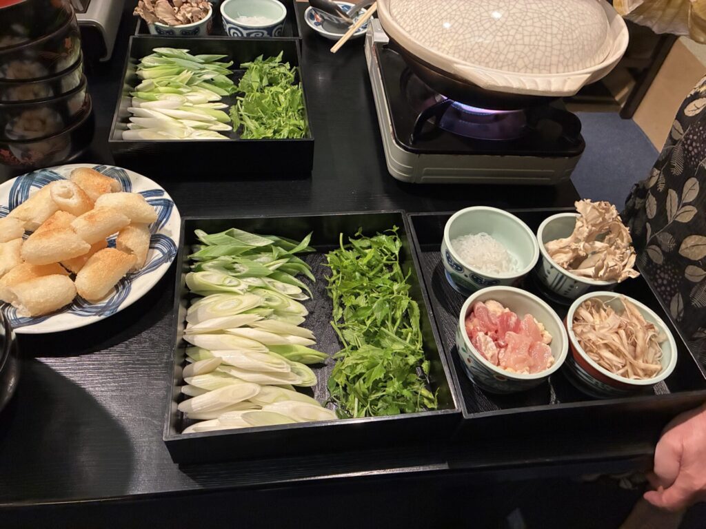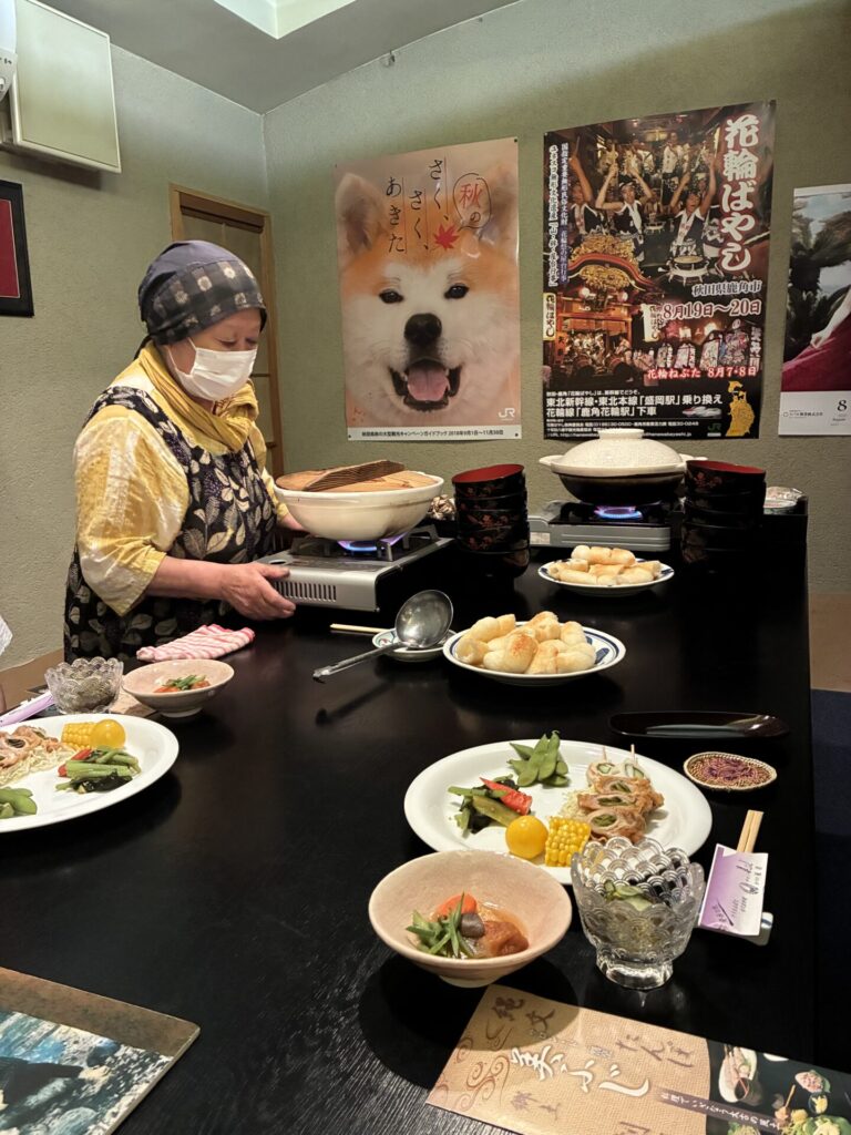 Een deel van de Kiritanpo eten we op deze manier, de rest van de kiritanpo snijden we diagonaal in stukken. Die gaan straks in de Nabe (zowel de naam voor het gerecht als voor de stenenstofpot). We snijden de rest van de ingrediënten voor de Nabe in stukken, zoals kip, de overgebleven Kiritanpo (zonder de misosaus), paddenstoelen, diverse groentes, enzovoort. In het restaurant staat al een tafel klaar met ons voorgerecht. Een bord met kleine gerechtjes: kip, viscake, mais en natuurlijk tsukemono (zuur) erbij. Terwijl we ons voorgerecht eten, wordt de dashi (Japanse bouillon) voor de Nabe warm gemaakt.