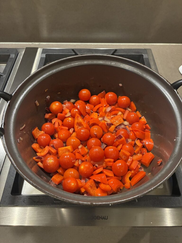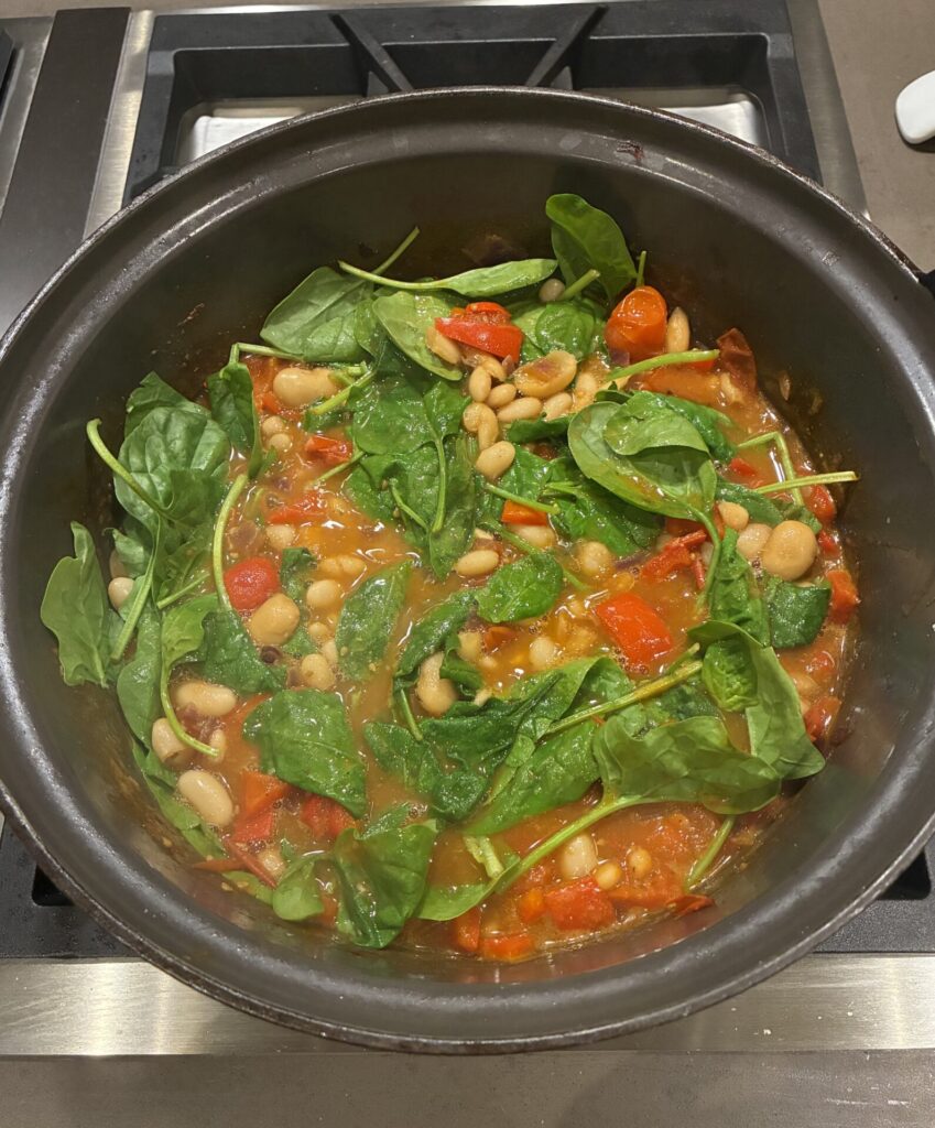 Chili van witte bonen en paprika is een recept uit de New York Times, dat ik regelmatig maak. Gewoon een heel lekker gerecht, makkelijk te maken, kindvriendelijk, herfstig en gezond. Door de sojasaus en de harissa komt de umami en pittigheid naar boven. Let wel op dat je niet in één keer de pepers en harissa erbij doet. Als je het te scherp maakt, is het waarschijnlijk niet meer kindvriendelijk. Dan maar wat extra kleingesneden pepertjes als garnering. Als het geheel te dik wordt, kun je er nog wat water bij doen, maar bij mij is dat nooit nodig. Als je de yoghurt en feta niet als garnering gebruikt, kunnen de veganistische vrienden ook gezellig mee-eten. En tot slot: perfect gerecht om in te vriezen, dus maak genoeg.