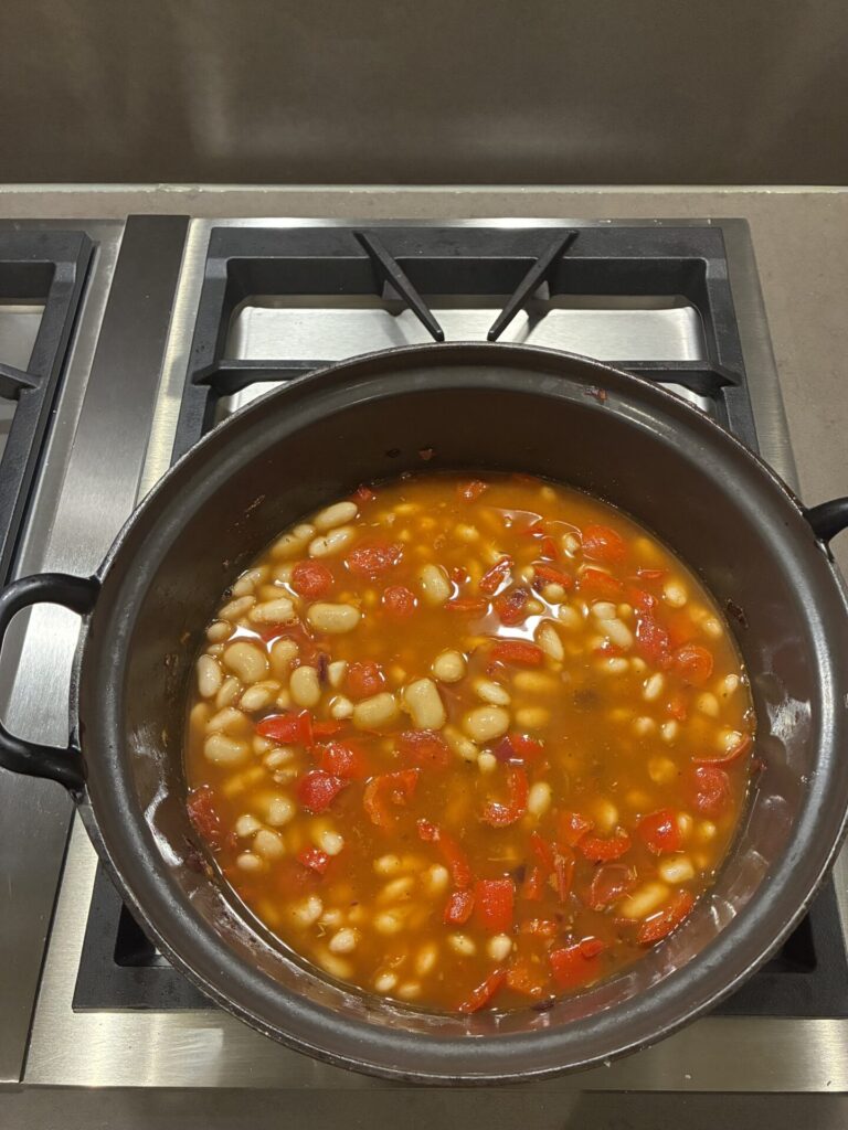Voeg de bonen en bouillon toe en breng aan een milde kook. Zet het vuur lager tot het geheel suddert. Kook ca. 12 tot 15 minuten tot de saus dikker wordt en de bonen zacht en crèmig. Druk de tomaatjes die niet zijn gebarsten tegen de wand van de pan om ze alsnog te breken.